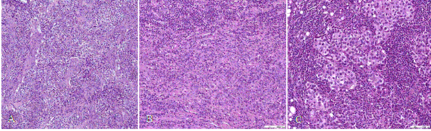 Рис.1. Морфологическое исследование биоптатов рака молочной железы. Окраска гем.-эозин. Общ. ув. х 200. Степени инфильтрации TILs: А) высокая, B) средняя, С) низкая. Примечание: составлен авторами по результатам данного исследования