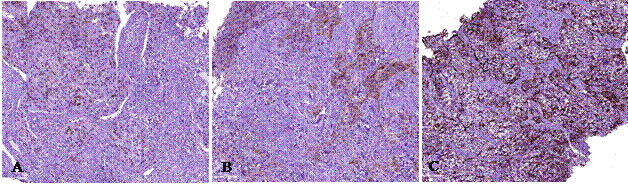 Рис.2. Морфологическое исследование биоптатов рака молочной железы. Иммуногистохимическое исследование с антителами к ICAM-1(CD54). Общ. ув. х 200. Характер экспрессии CD54 в опухолевых клетках: А) слабая очаговая, B) умеренная диффузная, С) выраженная диффузная.