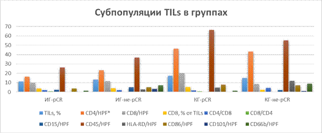 Для оценки связи между субпопуляциями TILs и pCR сравнивали количество TILs CD4+, CD8+, CD15+, CD86+, CD101+, CD66b+ в случаях pCR и не-pCR. Данные субпопуляций TILs в контрольной и исследуемой группах pCR и не-pCR представлены на рис.3.