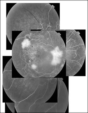 Рис. 1. Композиционный снимок данных флуоресцентной ангиографии левого глаза пациентки О. с тяжелой ПДР до проведения лазерного лечения.