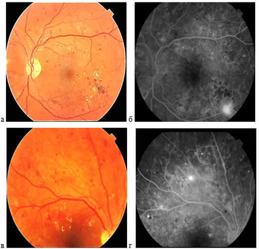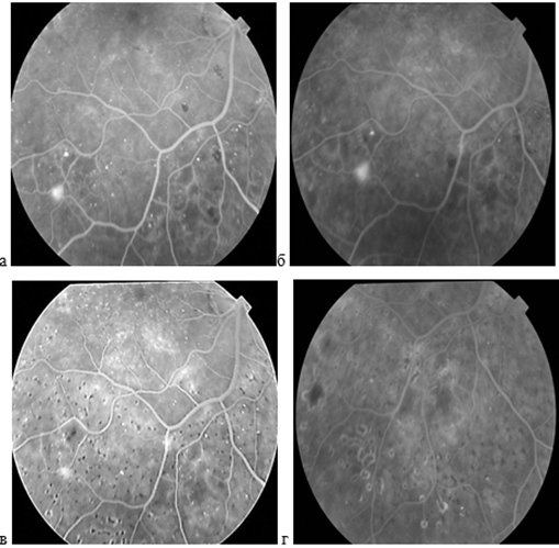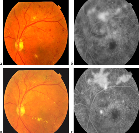 Рис. 4. Цветные фото и ФА левого глаза пациента В. с ПДР 1 стадии: а, б - через 6 месяцев после проведения панретинальной коагуляции; в, г - через 12 месяцев наблюдения.