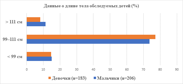 Рис. 1. Оценка показателей длины тела обследуемых детей в процентном соотношении, согласно нормативным таблицам ВОЗ для лиц данного биологического пола и возраста. Составлено авторами на основе данных, полученных в ходе исследования