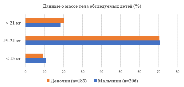 Рис. 2. Оценка показателей массы тела обследуемых детей в процентном соотношении, согласно нормативным таблицам ВОЗ для лиц данного биологического пола и возраста. Составлено авторами на основе данных, полученных в ходе исследования