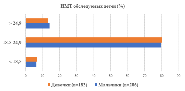 Рис. 3. Оценка ИМТ обследуемых детей в процентном соотношении, согласно нормативным таблицам ВОЗ для лиц данного биологического пола и возраста.