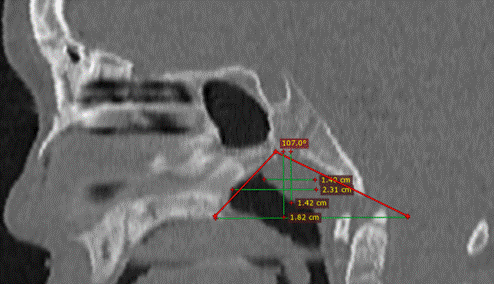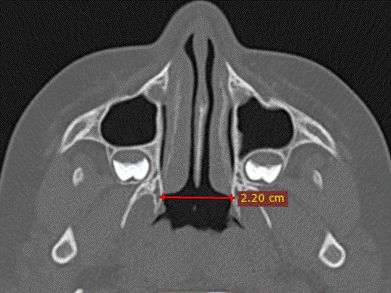 В аксиальной проекции измеряли ширину носоглотки как расстояние между латеральными точками хоан (рис. 2).